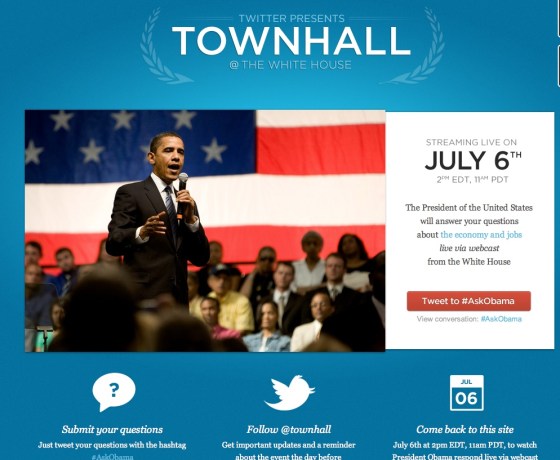 In coordinated tweets with Twitter, the White House announced that it will be holding a town hall on Twitter on July 6th, 2011 at 2 ET. Twitter launched a new @TownHall account for the event and a subdomain, AskObama.Twitter.com to host the live webcast.