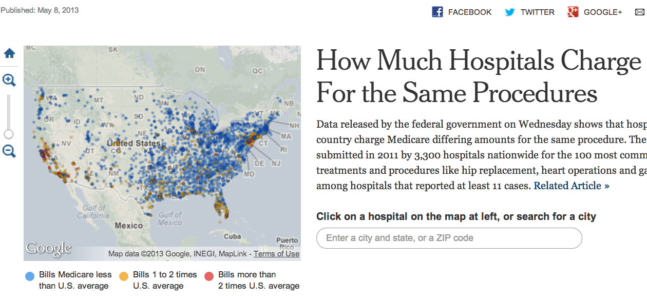 One hospital charged $8,000, another $38,000 — for the same condition. This data is enabling newspapers like the Washington Post to show people the actual costs of health care and create interactive features that enable people to search for individual hospitals and see how they compare. The New York Times explored the potential reasons behind wild disparities in billing at length today, from sicker patients to longer hospitalizations to higher labor costs.