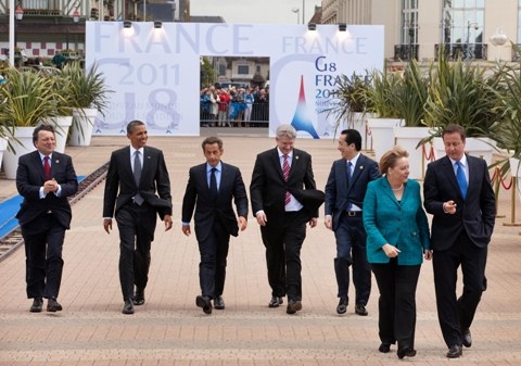 President Barack Obama and other world leaders walk to the first working session at the G8 summit in Deauville, France, May 26, 2011. Pictured, from left are: European Commission President Jose Manuel Barroso; President Obama; French President Nicolas Sarkozy; Canadian Prime Minister Stephen Harper; Japanese Prime Minister Naoto Kan; German Chancellor Angela Merkel; and British Prime Minister David Cameron. May 26, 2011. (Official White House Photo by Official White House Photo by Lawrence Jackson)