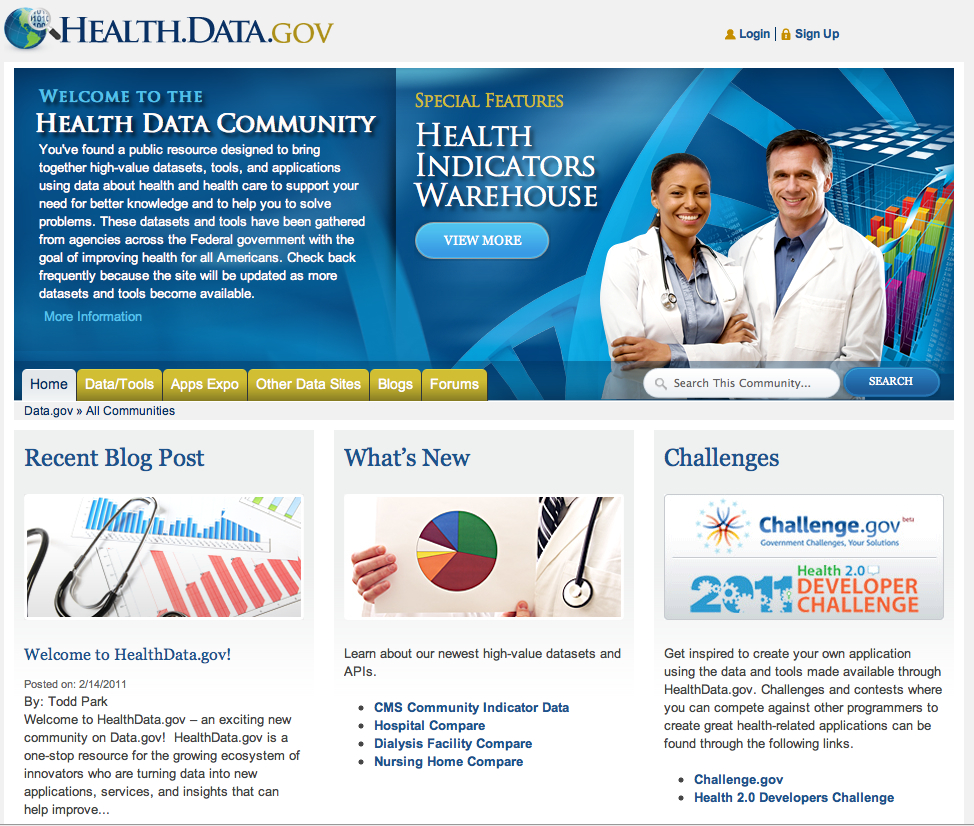 Last October, Todd Park, the chief technology officer at the Department of Health and Human Services (HSS) announced HealthData.gov at the HealthCamp in San Francisco. Today, Health.Data.gov went live. When the domain name propagates properly through the Internet, HealthData.gov will send online users directly to the new community at Data.gov.