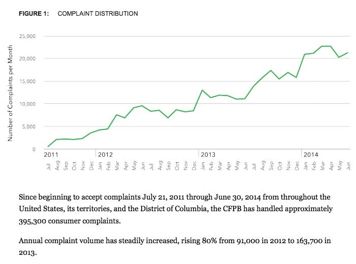 Today, the CFPB released an overview of complaints handled since the Bureau opened on July 21, 2011. (The graphics atop this post and below are sourced from this analysis.) According to the data inside, up until June 30, 2014, the CFPB has handled approximately 395,300 consumer complaints.
