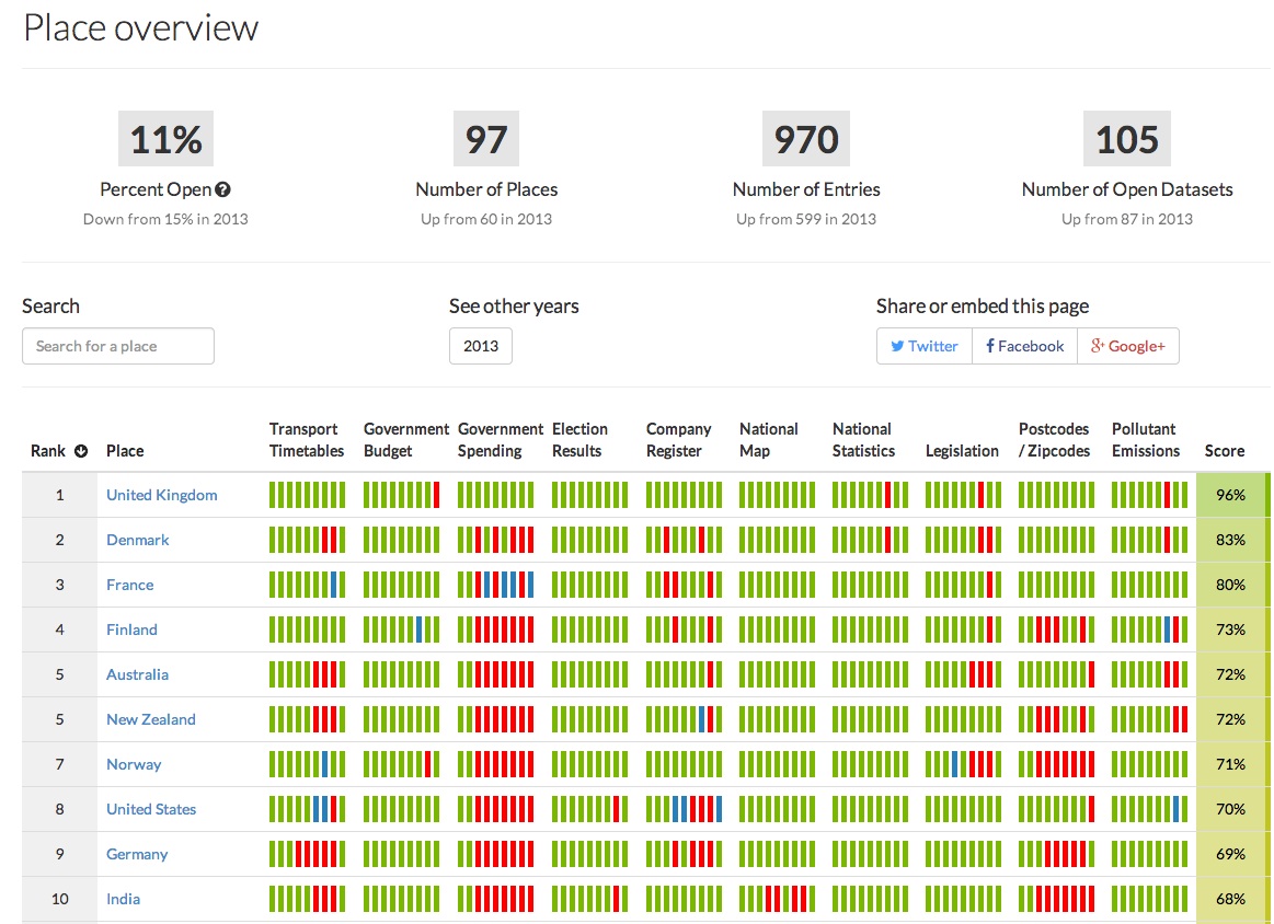 Open Knowledge also published a refreshed ranking of countries. The United Kingdom remains atop the list, followed by Denmark and France, which moved up from number 12 in 2013. India moved into the top 10, from #27, after the relaunch of its open data platform.