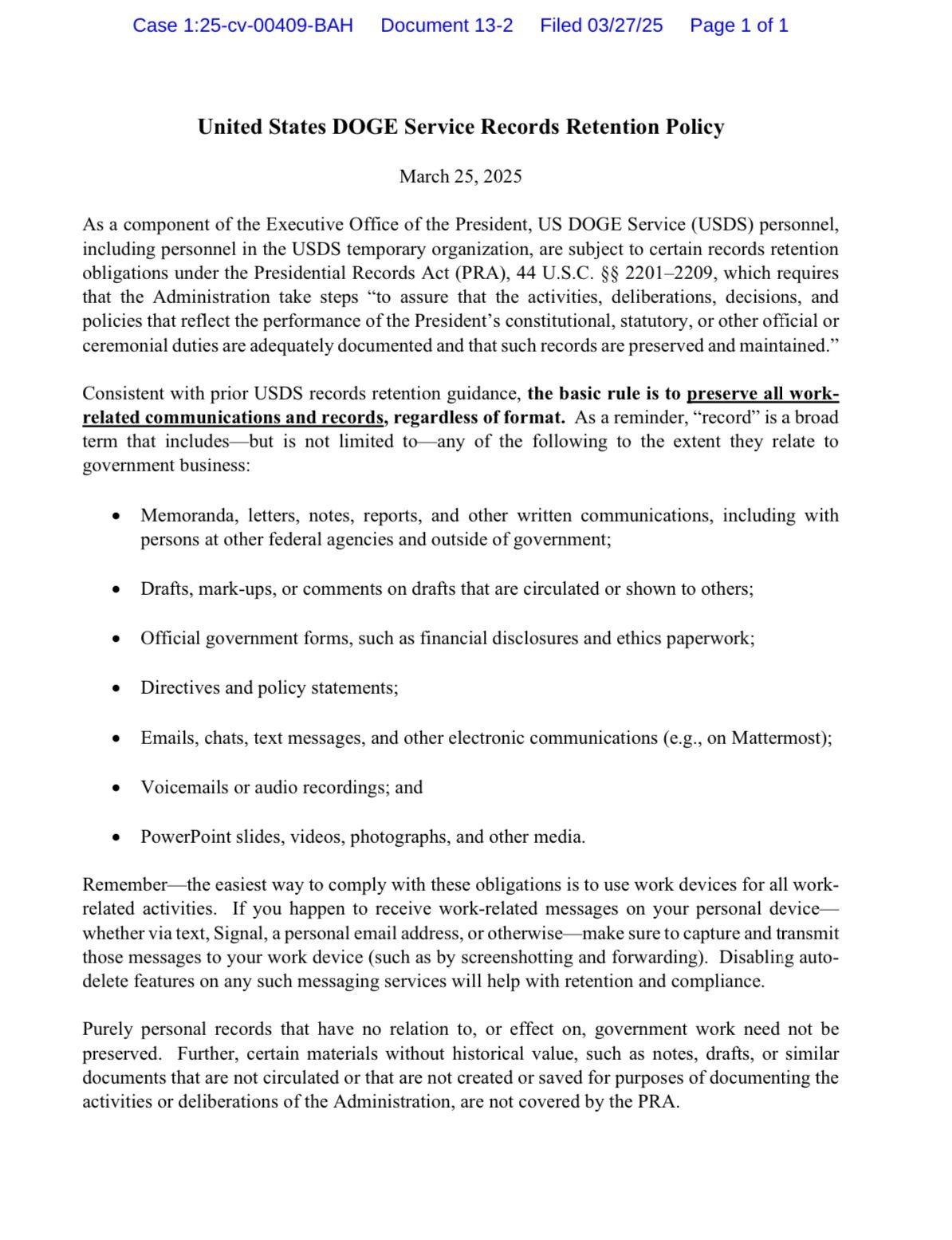 While there is no official public guidance from NARA, AOTUS, or CROTUS on the official use or Signal at present, Kyle Cheney reported that on Monday, March 25, 2025, the White House advised staff at the U.S. DOGE Service that work-related messages sent on personal devices and on Signal must be archived and that the auto-delete feature in the app should be disabled.