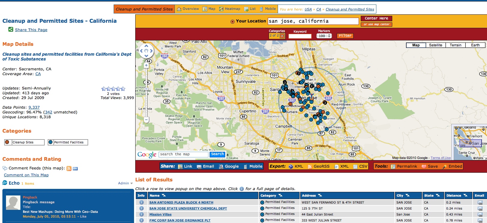California Environment Report: Cleanup Sites and Permitted Facilities (info page) provide residents with an interactive map that includes heatmaps, a mobile version with geolocation, data feeds, and detail pages for every cleanup site and permitted dacility from the CA Department of Toxic Substances Control Datasets.