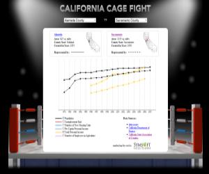 California Cage Fight (info page) allows residents to compare their counties with other California counties and the state as a whole, including population growth, per capita income, unemployment, new houses and more.
