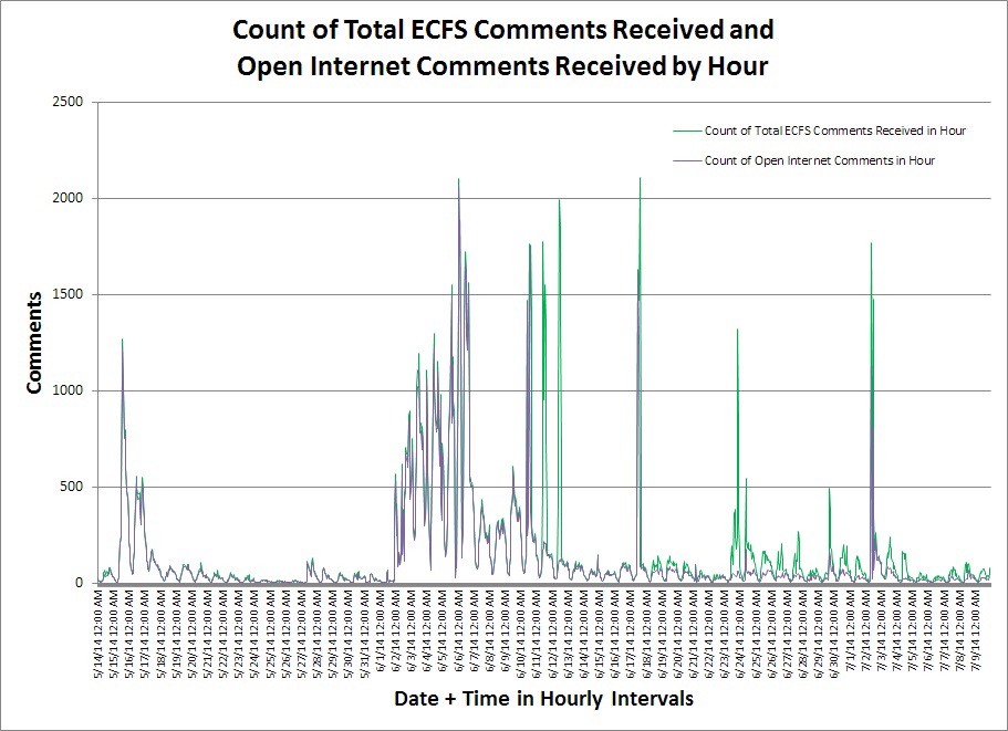 Chairman Tom Wheeler and I both enthusiastically support open government and open data, so with this post I wanted to share the hourly rate of comments submitted into the FCC’s Electronic Comment Filing System (ECFS) since the start of public comments on the FCC’s Open Internet Proceeding (Proceeding 14-28). Here’s a link to a Comma Separated Values (CSV) text file providing those hourly rates for all comments submitted to ECFS and those specific to the Open Internet Proceeding; below is a graphical presentation of that same data.