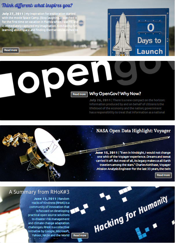 As I reported yesterday, NASA’s open government story now includes supplying the innovation behind OpenStack and Nebula. That said, while the technology behind the new NASA open government site and other initiatives is important to recognize, it has to be valued in terms of its ability to both host conversations and feature the people behind it. As NASA’s open government story evolves, cultural changes will be important to track, along with any technical milestones driven by open source or efficiencies driven by tightening budgets.