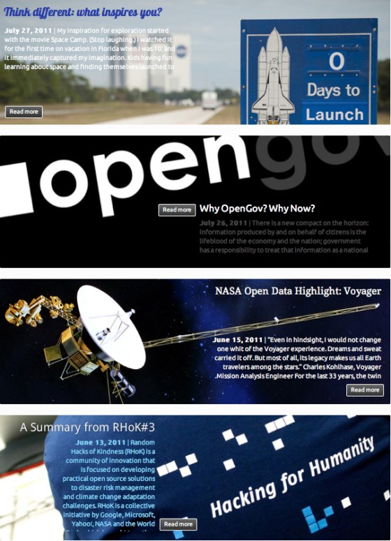 The new NASA open government is a beautiful departure from standard NASA websites. In fact, it’s a lovely move away from the Web design citizens encounter at most of the thousands of federal .gov sites. In part, that’s because the new NASA open government site is built upon General Service Agency-approved technologies and the same open source platforms ( like WordPress) that you’ll find at top-notch blogs like BoingBoing. (Or Govfresh). All due credit to Nick Skytland, Chris Gerty and Sean Herron for their hard work coding and designing the site as well. Skytland, who now heads up open government at NASA, wrote in to share his vision for the site and make a request: