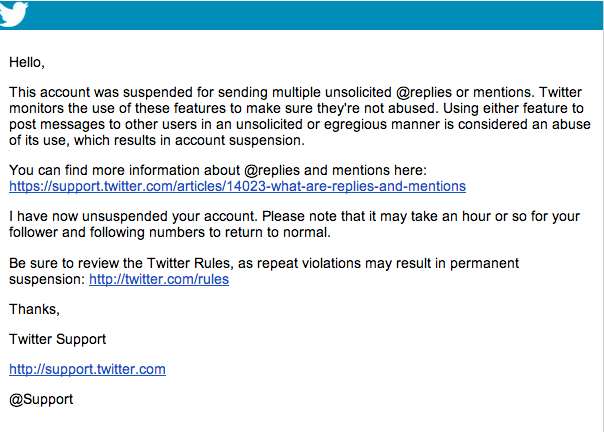 “This account was suspended for sending multiple unsolicited @replies or mentions. Twitter monitors the use of these features to make sure they’re not abused. Using either feature to post messages to other users in an unsolicited or egregious manner is considered an abuse of its use, which results in account suspension. You can find more information about @replies and mentions here:https://support.twitter.com/articles/14023-what-are-replies-and-mentions